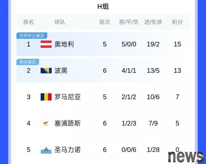 European World Cup Qualifying Group H: Austria leads with 5 consecutive wins, San Marino is at the bottom with 6 consecutive losses, goal difference -27