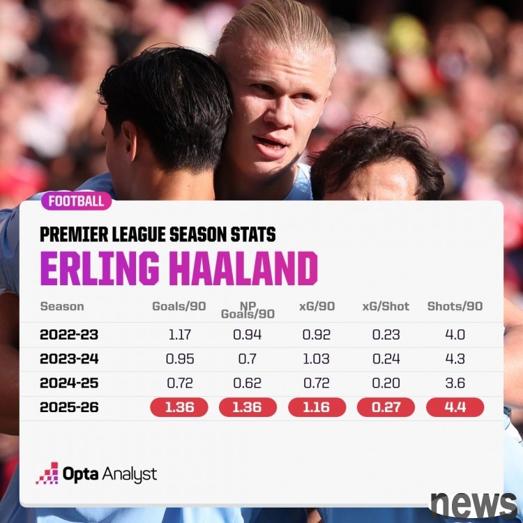 According to Opta statistics, Haaland's shooting, scoring and other statistics every 90 minutes this season have set a new Premier League career high.