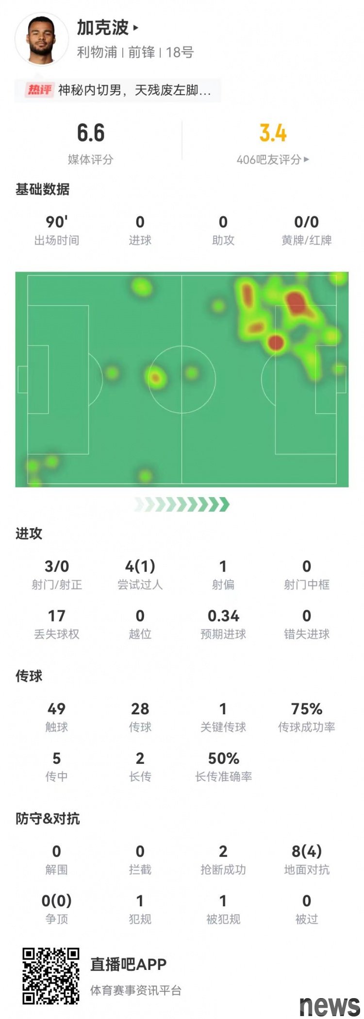 Jakpo had 3 shots, 0 on target, 5 crosses, 4 dribbles, 1 success, 17 lost ball rights, and was rated 6.6 points.