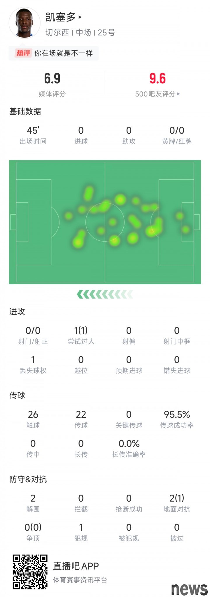 The 23-year-old Caicedo touched the ball 26 times in the half and only lost the ball once. His passing success rate was 95.5%, which stabilized Chelsea's midfield. In addition, he made 2 clearances and 1 pass.