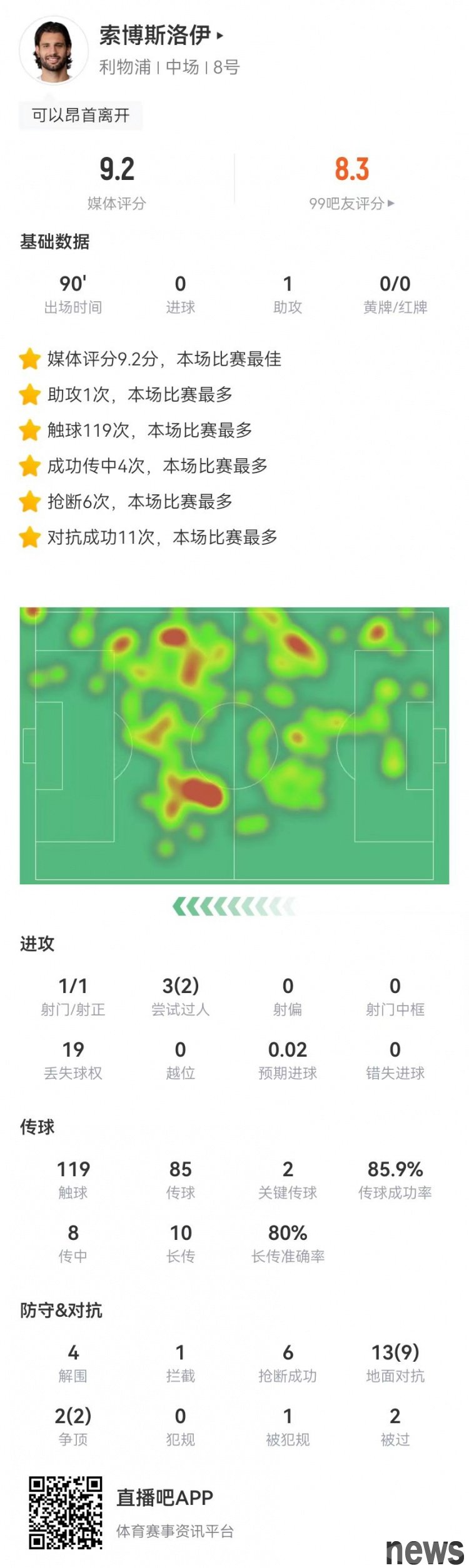 Sobo had 1 assist, 8 successful long passes, 4 clearances, 6 steals, 15 confrontations, 11 successes, and scored the highest score of 9.2 points.