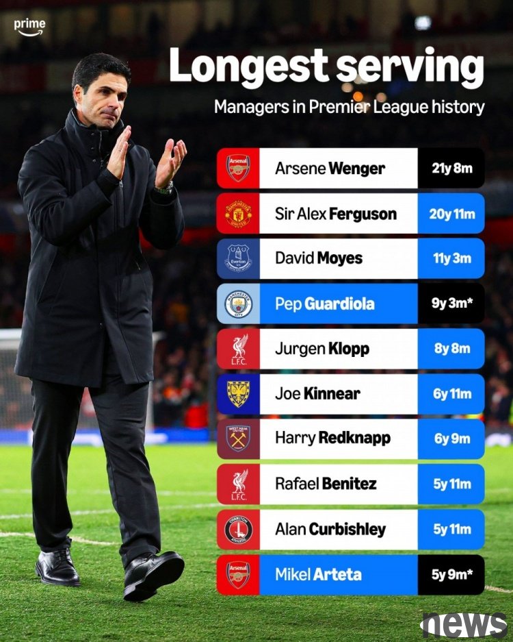 The media counted the length of time a coach has continuously coached a Premier League club and listed the longest time rankings. Wenger ranked first with 21 years and 8 months, followed by Ferguson, Guardiola fourth, and Arteta 10th.