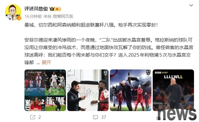 Many games in the League Cup ended, with Liverpool losing miserably to Crystal Palace and missing the chance to advance. Commentator Zhan Jun wrote after the game.